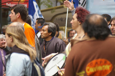 La primera fue del gremio de Municipales alrededor de las 1300 hrs, reclamaban por la inminente perdida de 700 puestos de trabajo que se producirian al cerrar un departamento (la llaman reestructuración).